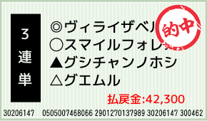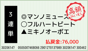 1着:◎マンノミューズ(1人気) 2着:○フルハートビート(4人気) 3着:▲ミキノオーボエ(2人気) 3連単:12-11-7:5,000円x15.2倍=76,000円 [hit_race:https://yoso.sp...