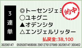 1着:○ユキグニ(3人気) 2着:◎トーセンジェミニ(1人気) 3着:△エンジェルリッター(4人気) 3連単:2-5-7:1,000円x38.1倍=38,100円 [hit_race:https://yoso.sp.ne...
