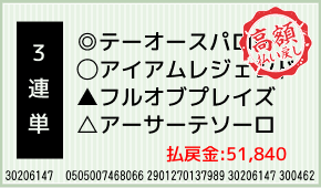 1着:◎テーオースパロー(2人気) 2着:△アーサーテソーロ(1人気) 3着:☆ゴールドイーグル(6人気) 3連単:8-11-7:400円x129.6倍=51,840円 [hit_race:https://yoso.sp...
