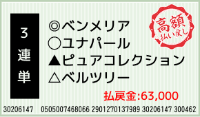 1着:◎ベンメリア(1人気) 2着:○ユナパール(2人気) 3着:▲ピュアコレクション(7人気) 3連単:6-8-5:2,000円x31.5倍=63,000円 [hit_race:https://yoso.sp.netk...