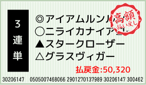 1着:◎アイアムルンルン(1人気) 2着:○ニライカナイアロー(2人気) 3着:△グラスヴィガー(10人気) 3連単:2-9-6:400円x125.8倍=50,320円 [hit_race:https://yoso.sp...