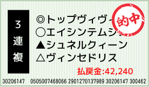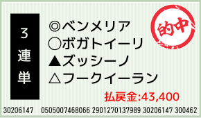 1着:◎ベンメリア(1人気) 2着:○ボガトイーリ(2人気) 3着:▲ズッシーノ(4人気) 3連単:6-2-1:7,000円x6.2倍=43,400円 [hit_race:https://yoso.sp.netkeiba...
