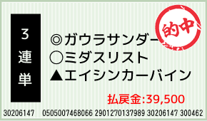 1着:◎ガウラサンダー(2人気) 2着:○ミダスリスト(3人気) 3着:▲エイシンカーバイン(1人気) 3連複:1-8-10:5,000円x1.6倍=8,000円 3連単:10-8-1:2,500円x12.6倍=31,5...