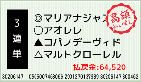 1着:○アオレレ(4人気) 2着:◎マリアナジャズ(2人気) 3着:注アスキステソーロ(6人気) 3連単:2-9-4:200円x322.6倍=64,520円 [hit_race:https://yoso.sp.netke...