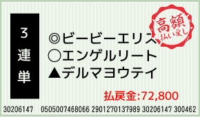 1着:◎ビービーエリス(1人気) 2着:○エンゲルリート(4人気) 3着:▲デルマヨウテイ(3人気) 3連単:3-7-5:8,000円x9.1倍=72,800円 [hit_race:https://yoso.sp.net...
