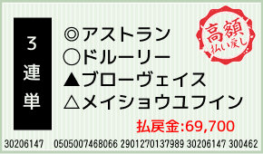 1着:◎アストラン(2人気) 2着:○ドルーリー(3人気) 3着:注ゲストプリンシパル(7人気) 3連単:2-9-10:1,000円x69.7倍=69,700円 [hit_race:https://yoso.sp.net...