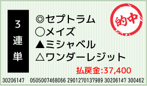 1着:◎セプトラム(1人気) 2着:○メイズ(2人気) 3着:☆テイエムファルクス(6人気) 3連単:5-6-7:1,000円x37.4倍=37,400円 [hit_race:https://yoso.sp.netkei...