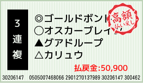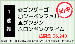 1着:注トーアカラカウア(6人気) 2着:△ロンギングタイム(5人気) 3着:◎ゴンザーゴ(9人気) 3連複:4-7-9:400円x90.6倍=36,240円 [hit_race:https://yoso.sp.netk...