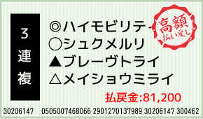 1着:◎ノアファラオ(9人気) 2着:○ブラウナイル(2人気) 3着:注ヴィルヘルム(7人気) 3連複:5-8-12:200円x166.0倍=33,200円 [hit_race:https://yoso.sp.netke...