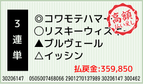 1着:◎コワモテハマー(4人気) 2着:△イッシン(3人気) 3着:○リスキーウィスキー(8人気) 3連単:300円x1199.5倍=359,850円 [hit_race:https://yoso.sp.netkeiba...