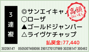 1着:▲ゴールドジャンパー(3人気) 2着:◎サンエイキャノン(2人気) 3着:注ブルーシャトー(11人気) 3連複:2-10-11:800円x96.8倍=77,440円 [hit_race:https://yoso.s...