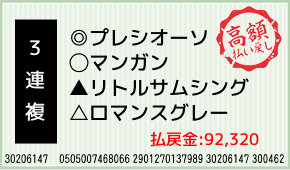 1着:○マンガン(2人気) 2着:注ペガサスターボ(8人気) 3着:◎プレシオーソ(3人気) 3連複:1-3-4:800円x115.4倍=92,320円 [hit_race:https://yoso.sp.netkeib...