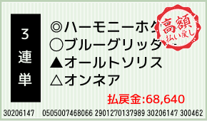 1着:▲オールトソリス(2人気) 2着:◎ハーモニーホクト(1人気) 3着:☆スイートウィル(11人気) 3連単:4-3-2:100円x686.4倍=68,640円 [hit_race:https://yoso.sp.n...