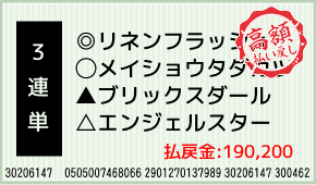 1着:○メイショウタダカツ(3人気) 2着:☆キャラメルコード(6人気) 3着:◎リネンフラッシュ(1人気) 3連単:9-1-11:500円x380.4倍=190,200円 [hit_race:https://yoso....