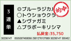 1着:◎ブルーラジカル(1人気) 2着:○トウショウクラウド(4人気) 3着:△ブラボーキリシマ (3人気) 3連単:6-1-4:1,300円x27.5倍=35,750円 [hit_race:https://yoso.s...