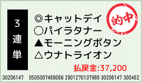 1着:◎キャットデイ(1人気) 2着:○パイラタナー(2人気) 3着:注スプリングレター (7人気) 3連複:1-3-8:1,000円x14.9倍=14,900円 3連単:1-8-3:500円x44.6倍=22,300円...
