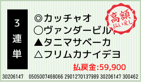 1着:○ヴァンダービルト(3人気) 2着:◎カッチャオ(2人気) 3着:△フリムカナイデヨ (5人気) 3連単:4-6-7:500円x119.8倍=59,900円 [hit_race:https://yoso.sp.ne...