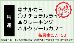 1着:◎ナルカミ(3人気) 2着:○ナチュラルライズ(1人気) 3着:△ルクソールカフェ(2人気) 馬連:5-15:5,000円x4.9倍=24,500円 馬単:5-15:1,000円x11.8倍=11,800円 3連単...