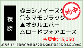 1着:◎フォーエバーヤング(1人気) 2着:○ レヴォントゥレット(2人気) 3着:☆ホウオウトゥルース(7人気) 3連単:7-10-5:1100円x38.5倍=42,350円 [hit_race:https://yos...