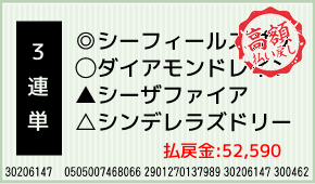 1着:☆ゲゾラ(3人気) 2着:◎シーフィールズプリ(1人気) 3着:○ダイアモンドレイン(5人気) 3連複:5-6-13:500円x36.3倍=18,150円 3連単:5-13-6:200円x172.2倍=34,440...