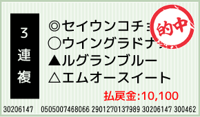 1着:▲ルグランブルー(2人気) 2着:△エムオースイート(1人気) 3着:◎セイウンコチョウ(4人気) 3連複:4-9-12:1,000円x10.1倍=10,100円 [hit_race:https://yoso.sp...