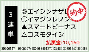 1着:○イマジンレノン(2人気) 2着:△コスモタイシ(3人気) 3着:◎エイシンナザレ(1人気) 3連単:1-5-7:400円x25.4倍=10,160円 [hit_race:https://yoso.sp.netke...