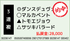 1着:◎ダンスデュヴァン(1人気) 2着:▲トモエジョウ(3人気) 3着:○マルカベント(2人気) 3連複:10,000円x2.8倍=28,000円 [hit_race:https://yoso.sp.netkeiba....