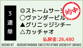 1着:◎ストームサージ(1人気) 2着:○ヴァンダービルト(4人気) 3着:△カッチャオ(2人気) 3連単:7-1-12:400円x66.2倍=26,480円 [hit_race:https://yoso.sp.netk...