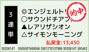 1着:◎エンジェルトリガー(1人気) 2着:○サウンドチアフル(3人気) 3着:☆アルジャヒリ(7人気) 3連単:3-1-2:500円x26.9倍=13,450円 [hit_race:https://yoso.sp.ne...