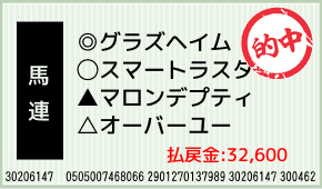 1着:◎グラズヘイム(2人気) 2着:○スマートラスター(1人気) 3着:▲マロンデプティ(3人気) 3連単:3-5-4:500円x25.2倍=12,600円 [hit_race:https://yoso.sp.netk...