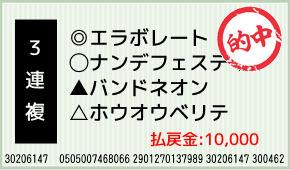 1着:注キタノインディ(1人気) 2着:◎エラボレート(7人気) 3着:▲バンドネオン(2人気) 3連複:2-6-8:200円x50.0倍=10,000円 [hit_race:https://yoso.sp.netkei...