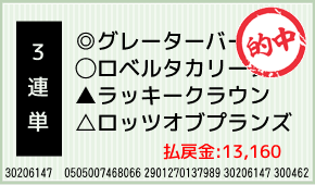 1着:○ロベルタカリーナ(3人気) 2着:◎グレーターバーチュ(1人気) 3着:注オプティクス(4人気) 3連単:10-9-8:400円x32.9倍=13,160円 [hit_race:https://yoso.sp.n...