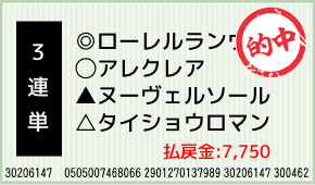 1着:◎ローレルランウェイ(1人気) 2着:○アレクレア(4人気) 3着:☆リトルシップス(2人気) 3連単:7-1-5:500円x15.5倍=7,750円 [hit_race:https://yoso.sp.netke...