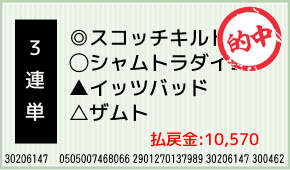 1着:◎スコッチキルト(1人気) 2着:注ミンナノブンモ(4人気) 3着:☆タイガーハート(2人気) 3連単:14-5-8:100円x105.7倍=10,570円 [hit_race:https://yoso.sp.ne...