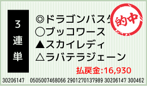 1着:◎ドラゴンバスター(1人気) 2着:注マキズシトイナ(10人気) 3着:▲スカイレディ(2人気) 3連単:6-10-7:100円x169.3倍=16,930円 [hit_race:https://yoso.sp.n...