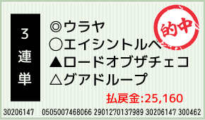 1着:注レディブラウン(4人気) 2着:◎ウラヤ(1人気) 3着:○エイシントルペード(2人気) 3連単:6-2-4:200円x125.8倍=25,160円 [hit_race:https://yoso.sp.netke...