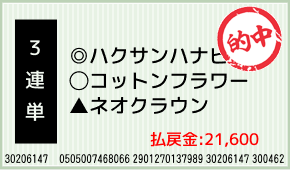 1着:◎ハクサンハナビ(1人気) 2着:○コットンフラワー(2人気) 3着:▲ネオクラウン(3人気) 3連単:2-4-5:8,000円x2.7倍=21,600円 [hit_race:https://yoso.sp.net...