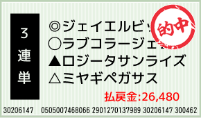 1着:◎ジェイエルビット(2人気) 2着:○ラブコラージェン(1人気) 3着:△ミヤギペガサス(4人気) 3連複:1-4-7:1,600円x6.6倍=10,560円 3連単:4-7-1:800円x19.9倍=15,920...