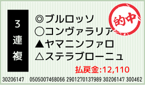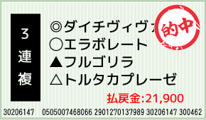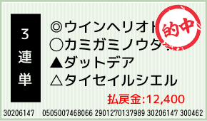 1着:◎マンノミューズ(1人気) 2着:○フルハートビート(4人気) 3着:▲ミキノオーボエ(2人気) 3連単:12-11-7:5,000円x15.2倍=76,000円 [hit_race:https://yoso.sp...