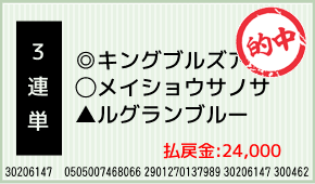 1着:◎キングブルズアイズ(1人気) 2着:○メイショウサノサ(2人気) 3着:▲ルグランブルー(4人気) 馬連:5-11:3,000円x1.8倍=5,400円 3連単:11-5-6:1,500円x12.4倍=18,60...