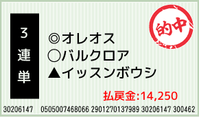 1着:◎オレオス(1人気) 2着:▲イッスンボウシ(2人気) 3着:○バルクロア(3人気) 3連単:2-5-4:2,500円x5.7倍=14,250円 [hit_race:https://yoso.sp.netkeiba...