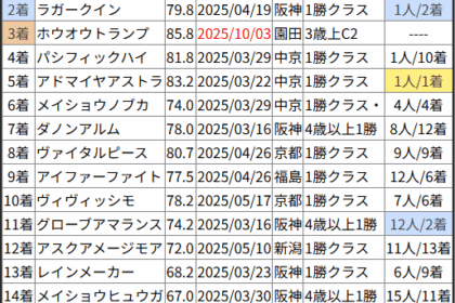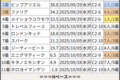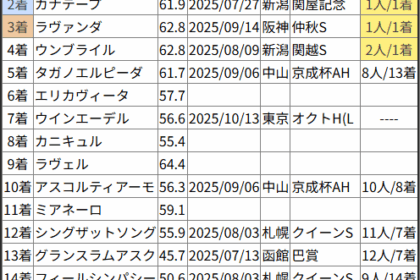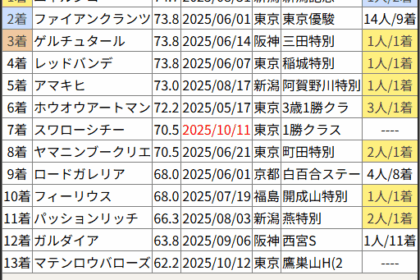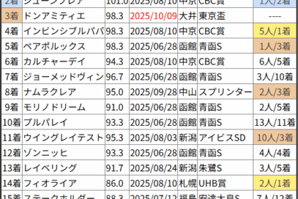 ※見解・買い目はこちらを参照ください。 前走戦った相手が次走好走しているレース出身馬の一覧です。 今回のメンバー相手に通用するかは、スピード指数表と合わせてご覧下さい。 2025/10/11 東京7R 1勝クラス:結果 ...