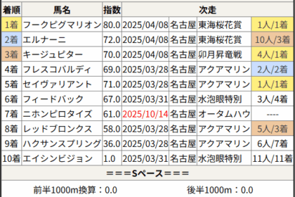 ※見解・買い目はこちらを参照ください。 前走戦った相手が次走好走しているレース出身馬の一覧です。 今回のメンバー相手に通用するかは、スピード指数表と合わせてご覧下さい。 2025/10/06 水沢1R C2:結果 2.フ...