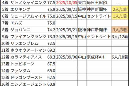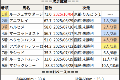 ※見解・買い目はこちらを参照ください。 前走戦った相手が次走好走しているレース出身馬の一覧です。 今回のメンバー相手に通用するかは、スピード指数表と合わせてご覧下さい。 2025/10/05 東京1R 未勝利:結果 10...