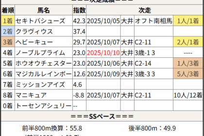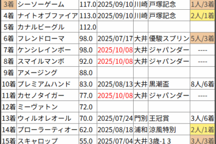 ※見解・買い目はこちらを参照ください。 前走戦った相手が次走好走しているレース出身馬の一覧です。 今回のメンバー相手に通用するかは、スピード指数表と合わせてご覧下さい。 2025/10/10 大井1R 3歳-1 3歳-2...