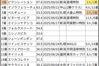 ※見解・買い目はこちらを参照ください。 前走戦った相手が次走好走しているレース出身馬の一覧です。 今回のメンバー相手に通用するかは、スピード指数表と合わせてご覧下さい。 2025/10/25 新潟4R 1勝クラス(牝):...