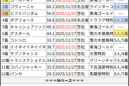 ※見解・買い目はこちらを参照ください。 前走戦った相手が次走好走しているレース出身馬の一覧です。 今回のメンバー相手に通用するかは、スピード指数表と合わせてご覧下さい。 2025/12/31 水沢1R C2-4:結果 4...