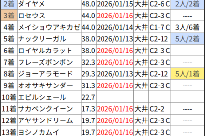※見解・買い目はこちらを参照ください。 前走戦った相手が次走好走しているレース出身馬の一覧です。 今回のメンバー相手に通用するかは、スピード指数表と合わせてご覧下さい。 2026/01/16 大井1R C3-2 C3-3...