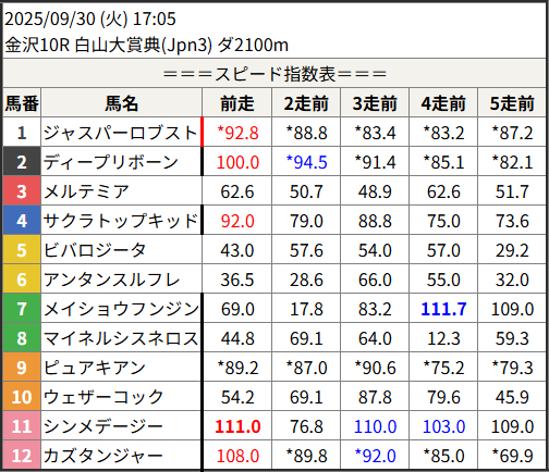 Home / 予想データ / 2025/09/30 スピード指数表スピード指数予想データ2025/09/30 スピード指数表による shunrai コメントはまだありません2025年9月29日 19:53 ※見解・買い目はこちらを参照ください。 門別 水沢 船橋 金沢 名古屋 佐賀 共有: クリックして X で共有 (新しいウィンドウで開きます) X クリックして友達にメールでリンクを送信 (新しいウィンドウで開きます) メールアドレス Facebook で共有するにはクリックしてください (新しいウィンドウで開きます) Facebook いいね:いいね 読み込み中…Share ArticlePrevious Article2025/9/29 水沢8R 3連複▲◎注 77,440円🎯Next Article2025/09/30 次走好走馬の目立つ組出身shunraiRelated Posts 2025/11/15 スピード指数表 2025年11月14日 2025/11/14 スピード指数表 2025年11月13日 2025/11/13 スピード指数表 2025年11月12日コメントを残す コメントをキャンセルメールアドレスが公開されることはありません。 ※ が付いている欄は必須項目ですコメント名前 メール サイト 次回のコメントで使用するためブラウザーに自分の名前、メールアドレス、サイトを保存する。 Δ
