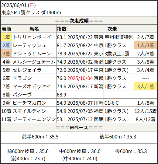 2025/10/04 東京7R 1勝クラス・牝:結果